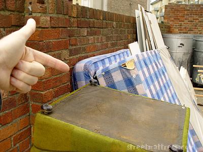 | The two bases had this mattress pinned against the wall while the upside-down green armchair looked on. I think they were after his dinner money. |