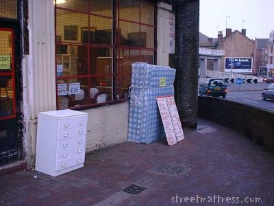 | This mattress was hanging out in Luton Road still in its wrapper, a snip of a bargain at a mere 95.00 pounds, thats about 150 dollars. |