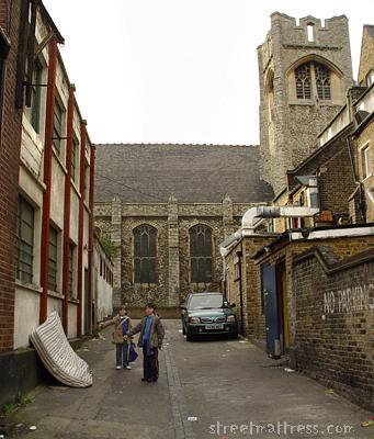 I'm fairly certain that this is the first mattress pic of mine which includes one of Acton's churches. The end of the white building is a popular mattress spot (e.g. #6732) but for the first time we are looking up the back alley instead of down it.