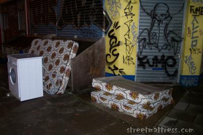 Another injured bed base, a threatening washing machine, a nervous matt and nearby graffitti that reads "ugly 1". Par for the course in KingsX I'm afraid.