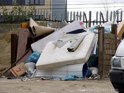 | Two matts and two toilets by the railway line. |