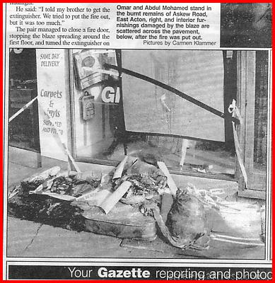 This pic from today's Ealing & Acton Gazette shows a poor mattress victim of a night-time fire above the Askew Carpet Warehouse (see psychobabble's #6612 or Vogon3's #5702). You can see the "G" of "free gripper" in this pic. Two brothers heroically saved all the building's occupants. The caption makes it sound as if the whole of Askew Road burnt down!