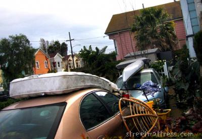 i almost called this shot 'confrontation.' the weird thing is these cars stay put. they're parked there just to keep the kayak and mattress off the ground, i guess.