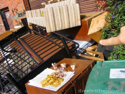 a very strange offering of food - chips (crisps for the Euros) and little plastic cups with candies accompanied this pile if discarded furniture. I passed on the snacks but took the picture