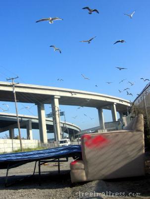 as i was taking pictures of this sofa bed a semi truck drove by stirring up the commotion of gulls. the gulls hangout at the recycling yard on the other side of the fence.