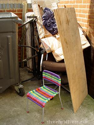 | Colourful little chair putting dull mattress to shame. See how it cowers by the back wall of the skipshack. |