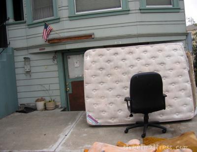 Well it strikes me as some sort of conceptual art installation, or perhaps a large easel or white board for making presentations at company meetings. Or maybe just a place to go sit and think about reclining. Maybe it would be better if the chair was lying on its back, to go with the vertical mattress. Or, possibly I have over-analyzed the whole thing and this mattress has been put in place by the residents to block noise from the street or cover a broken window.