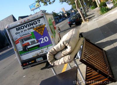 a younf woman was standing by a pile of household belongings on the street, including this futon. as i stopped on my bike to take a picture she got into the u-haul van and drove off. then i noticed prices on everything, as if she was trying to sell all her belongings.