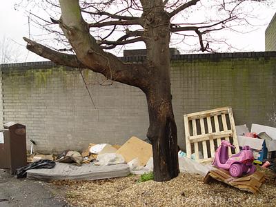 | A pile of rubbish had recently been set on fire beneath this tree. |