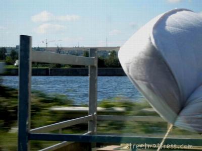 I love this picture. The ballooning matt, the inviting blues, the ripples and the blurs, cranes in the distance and a sturdy steadying frame close by. Swap lives, Wim?