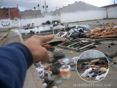 | had to reach through a locked gate. that is a matt with the blue flower motif. it was all cleaned-up the next day. |