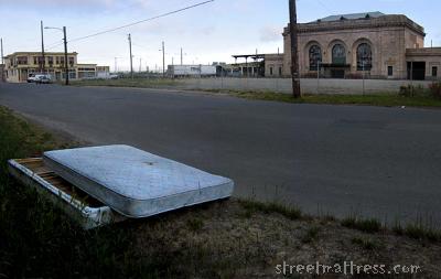 i've been waiting for someone to dump a matt outside the West Oakland train station. It was abandoned after the 1989 earthquake. there are a number of proposals to revitalize it - one as a museum. It was also used as a location in the movie 'Rent.'