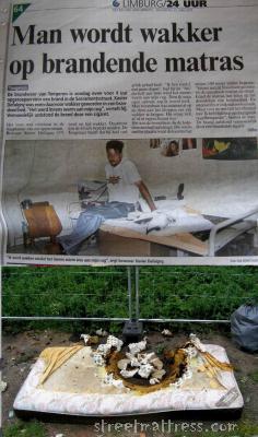 sheer coincidence. I had to be in Tongeren (courthouse) and had finished earlier than thought, so I went for a coffee, read the news and fell over this article. I admit, the man does not look wide awake, but who am I to judge. Anyway,in the article it says that neighbours threw out the burning matt on the street (street of sacraments) and that the fire brigade solved everything. As it happened on a sunday I hoped the matt would still be out in the open, so I searched the sacramentsstraat and Bingo! there it was. The matt on the street and the bed belonging to the matt with its occupant wide awake and fit in the media.