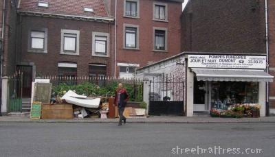 quite a collection of trash, but the shop is no better:ambulance, pompe and funeral, undertaker, day and night, repatriation in belgium and abroad, flowers and funeral articles! With al that one might think his door opens easy enough, but there is a sign "push hard". No wonder the man sulks a bit. Could not make his choice in the shop, nor within the articles next to the mattress