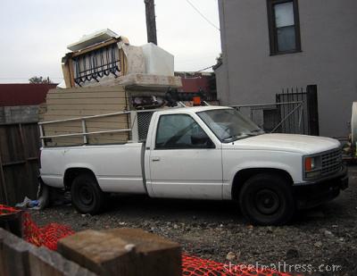 saw the matts peaking over from another angle. new it was a truck. raised my camera over the fence and caught this all most new pickup. seems they have to hide the new trucks in west oakland. don't want to ruin their reputation for classics.