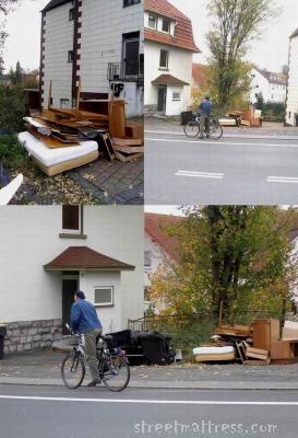 actually it was the first matt I spotted in Hemer, but we did not stop because my mother wanted to be on schedule for the picture of her group confirmees 1942; a it was sunday I was sure the mattress would still be there later that day, after the photoshoot; and it was. I parked, pointed and walked back to my car when the man on the bike appeared, stopped and looked as if he could use things, on second sight he did not and left, gliding down into Hemer
