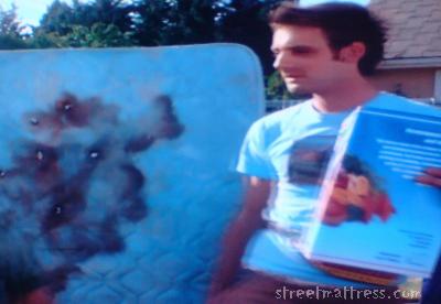| Reaper trying to sell a bloodstained mattress at a lawn sale. |