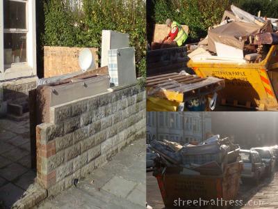 I went passed the Matts and Base leaning against the wall. On my return about an hour later, the skip was there and almost full. A workman had cut everything up bar one chair, which he was sawing as I went by.