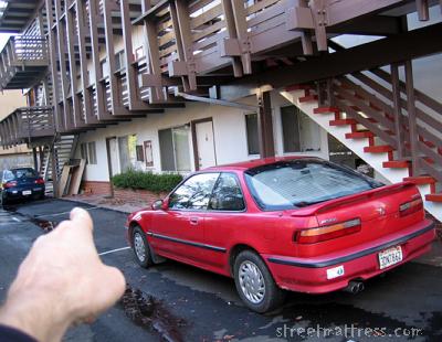 | i'm liking the red steps next to the red car |