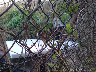 | The white skin of this babymatt gave away its hiding place behind the brambles and fence. |