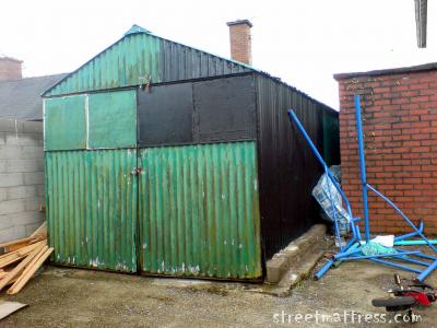No hiding place for this matt. A reluctant streetmattress, it tried squeezing down the side of a shed.