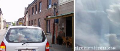 you just have to believe me on this one, I walked from my office to my house for lunch, new camera at hand when the car passed me and I thought "damned, a mattress" I took the camera and ran after the car hoping it would turn right with the mattress clearly in sight, but it turned left, so I ran after it and had to content me with the backside, but it is clearly visible in the enlargement, I know, but you just have to believe me
