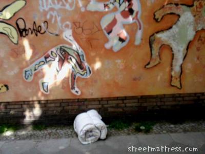 I wanted to put in more walls, I wanted to give it another title (de bokkerijders) but actually this was my first mattress in berlin and the idea that it would be the only one frightened me, after all it was just a one day trip, flying in early in the morning and flying out early in the evening, but it looks as though a lot has fallen