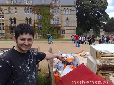 Patryk points to a disgraced mattress in a stinking skip in front of Christ Church College, Oxford, while hordes of ignorant tourists pass by on the other side.