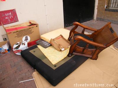 | A black and tan folding matt, probably from a sofa-bed. Box at rear once contained an "executive multifunction massage chair". Must get one. |