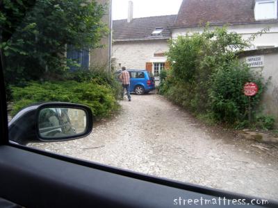 I saw two people carrying a matress, camera not and hand, not ready, and by time I tried to park, they were almost gone,in the impasse des vinées, sortie de voitures, prière de ne pas stationner, the man murmured something like " nevermind the idiot belgian car" they are like that in the auvergne