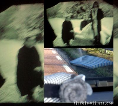 the one serving as background and upper picture did not make it, it is from a film at the biennale in venice by the german artist Ulla von Brandenburg, born in Karlsruhe. In 1899 my oma was born in Wersten, Germany. On the way back from Venice I was tipped there was a matress in Lanklaar, being too far away (Italy) I tipped Jaak. Coming back a few days later, the matt was still there, so here it is with a Venetian hat, and Ulla's Singspiel too.