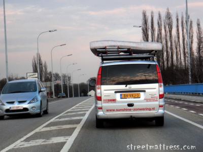 the van with the dutch micence plate is in belgium, the one with the belgian licence comes from holland, the bridge is ober a canal, the trees are in holland, both cars are in belgium, clouds are in the sky and in the rear view, life is beautyfull, sunshine borderline