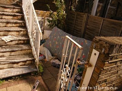 Up a grimy alley full of men drinking. You can see Wim's camera at the bottom of the pic.