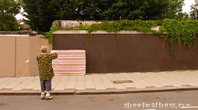 We were just in time here. Passing by a few minutes later, we saw that the matt had gone. Later still, Wim photographed it again in the back of a council truck.