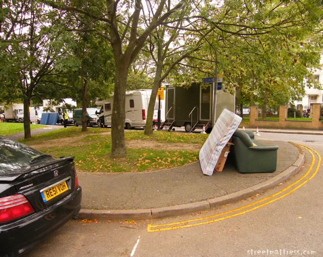 Today "Waking the Dead", a BBC police drama series, was being shot in my 'hood. The matt and sofa were not in the usual place, and when I returned half an hour later they were gone. The blue matts in the background are "crash mats" for stunt work - the sort of mat the late lamented Vogon3 would submit occasionally.