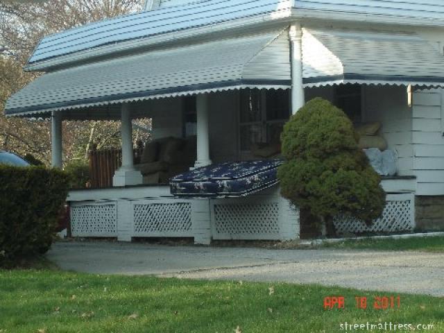 As Alice & I were taking pictures of the mattresses on the tree lawn of this house, Alice looked up and saw this brand new mattress hanging over the porch. I wonder how long it was like that or if it has been moved yet?