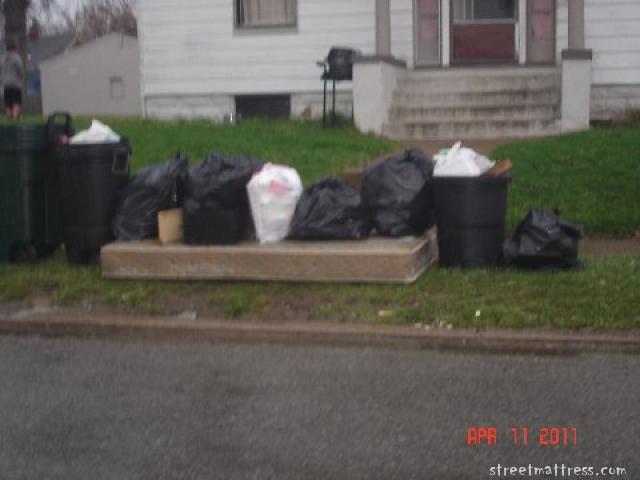 | The wind was blowing so hard that I guess the trash was hold this mattress down from blowing away. |