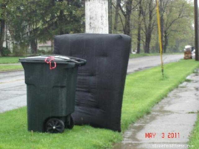 | Alice was working one day and I had to go to Wal-Mart. Found this mattress on my way to Wal-Mart. I like the pink ribbon on the trash can. |