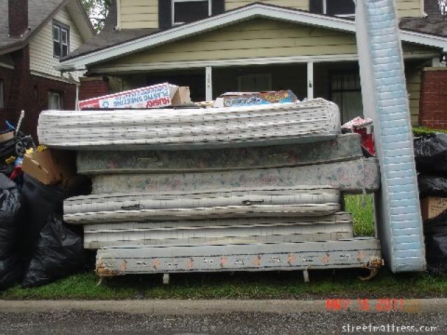 Alice came home from work and told me that there was a stack of mattresses right around the corner. I jumped in my car and went around the corner and found this stack of six mattresses and a box spring. Later that night, Alice and I went past this stack again and the top mattress and box spring was gone. We just can't believe that people take other people's mattress out of the trash and take them home to sleep on. There has been many times that we see a mattress, go back 5 minutes later and the thing is gone. It just happened to us a couple of weeks ago, we saw a mattress, went down the street and turned around, came back and it was gone.