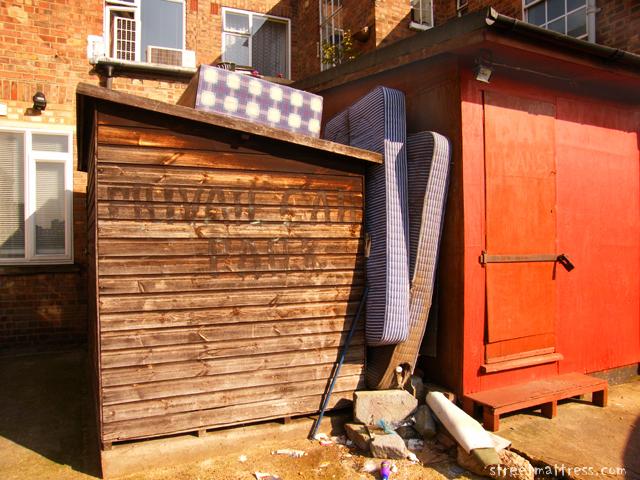 | Same matts, very different sheds. Big hole at the bottom of one matt, with a bottle shoved in it. |