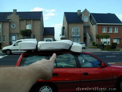 The car is an Opel, with Dutch licence plates, so the matress is an emigrant, probably on its way to a happy life with weed and stuff and coffeshops nearby in Maastricht (The netherlands), which is about 3 miles from this place. In the back, typical Belgian houses from the last 8 yeras or so.
