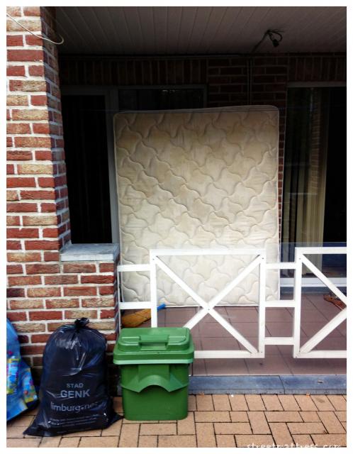 green for GFT, blue for PMD, black for small rest, the matt probably for the big rest, not on the picture : a bin for glass (white and coloured) and a pile for paper