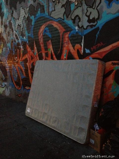 Spotting a street mattress in front of a colorful graffiti wall!