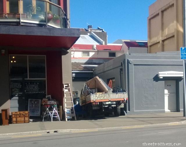 | Matt on back of ute outside antique shop. Not sure if the little truck is loaded up with stuff they are hoping to sell or stuff going to the dump. |