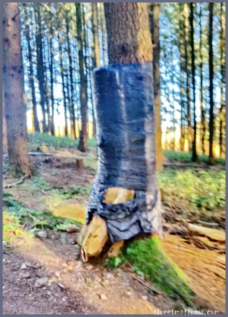 in the middle of the woods, a mattress tied against a tree, waiting for bikers to avoid
