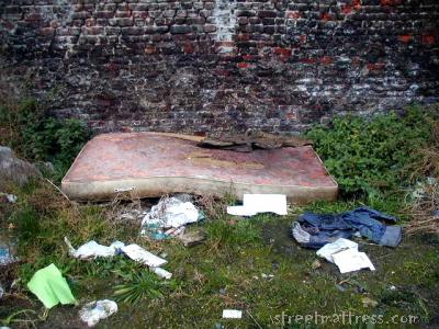 This mattress looks like it was used to catch the oil when someone changed the oil in their car. Afterward, the mattress was placed outside to see if the rain and snow would get it clean again. -- It didn't work!!! Maybe next time they could use an old feather pillow to catch the engine oil!!! That would be very intresting.