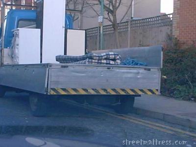 | A very sorry folded and lumpy looking mattress on its way into a house. When I saw this I thought they were throwing it out! |