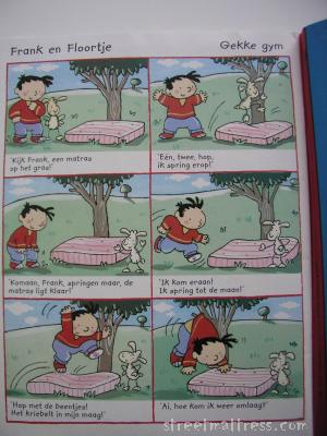 The story : "Look frank (not our Belgian friend!), a matt on the grass! 1,2,3 hip,i jump on it" come on frank, jump along, the matt is ready! i am coming, i'll jump to the moon! hop with my legs, it tickles my stomach! ai, how will i come down again?"
