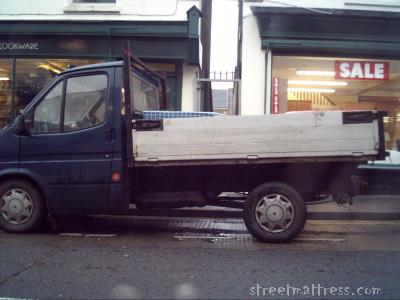 | Another mattress on the run, I think this one is trying to make it out of the country by lying low in the back of this flatbed Transit van. |