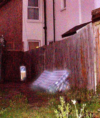 This "keep left" bollard had been taken up a dead end alley between back gardens to keep the mattress company. An enhanced photo taken from a vast distance as twilight descended.
